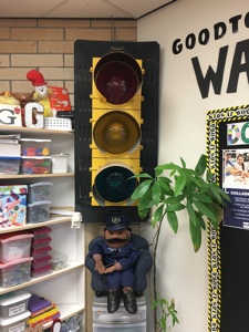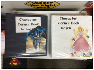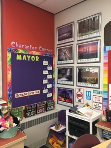 Character Corner: This is the corner of our town where all the Goodtown values hang: determined, friendly, helpful, honest, positive, respectful, responsible. It is also the home for character corner books, mayor of the week poster, superman, and the power chair.